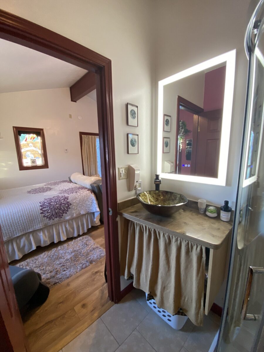 The studio suite is for the guest who is looking for an extra special getaway offering romance and a very relaxing atmosphere, (costing less than a hotel room). Upon entering your room, you are immediately enchanted with custom artwork specially designed for the room. Because it only has one queen bed, we limit it to a two people.